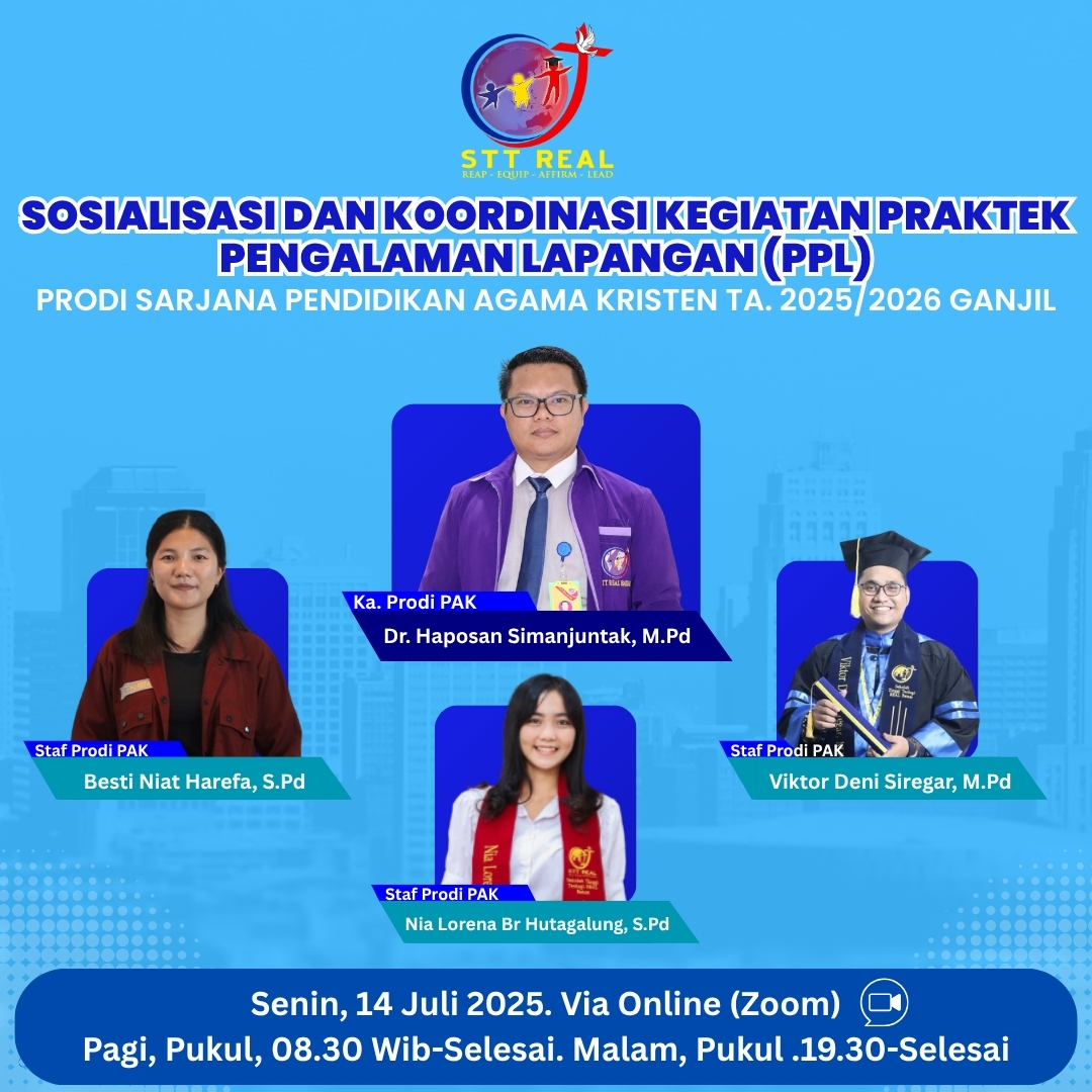 Batam, 14 Juli 2025 – Sekolah Tinggi Teologi REAL Batam melalui Program Studi Sarjana Pendidikan Agama Kristen (PAK) menyelenggarakan kegiatan Sosialisasi Praktek Pengalaman Lapangan (PPL) Tahun Akademik 2025/2026 Ganjil sebagai bentuk kesiapan dan pembekalan awal bagi mahasiswa sebelum terjun langsung …
