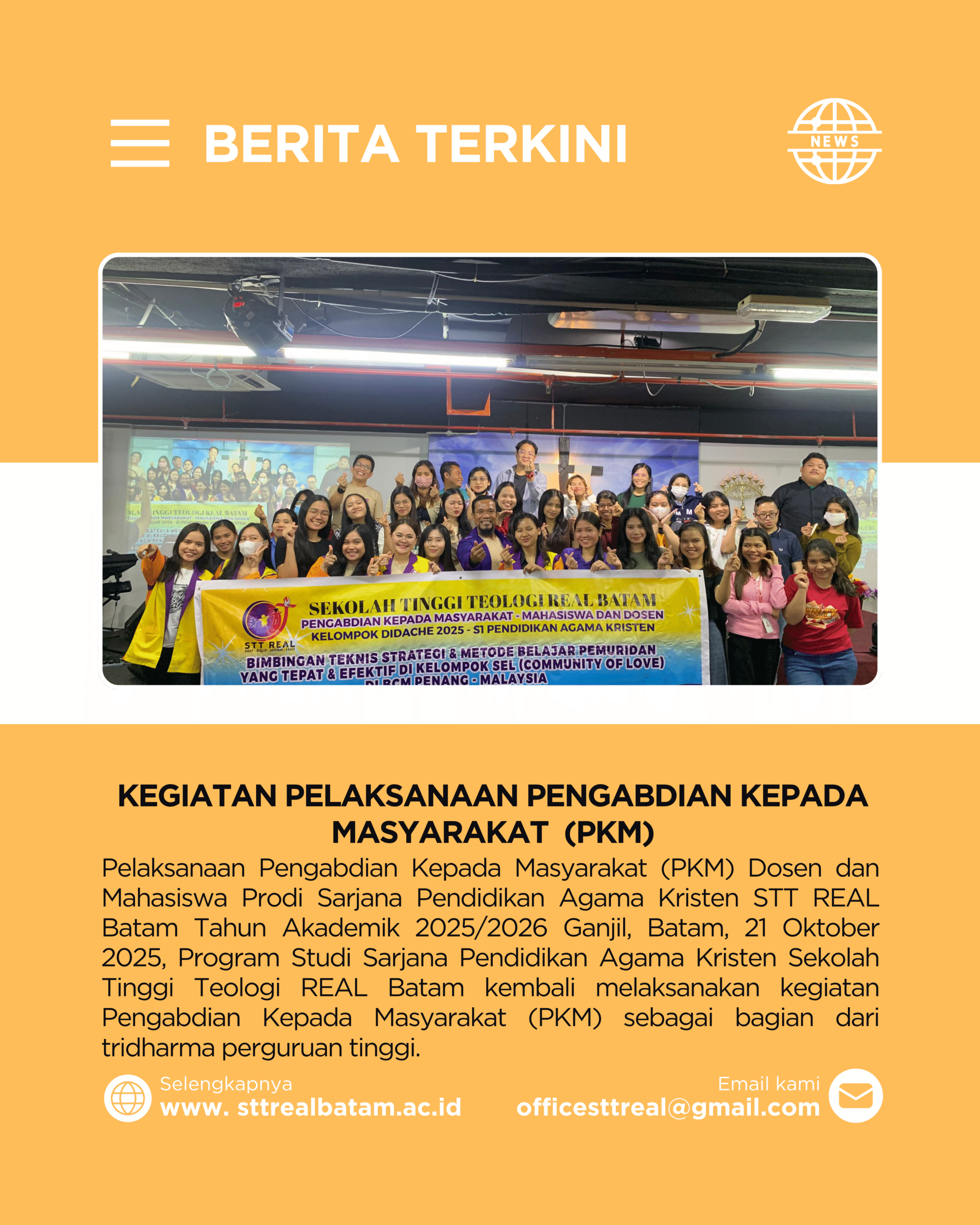 Pelaksanaan Pengabdian Kepada Masyarakat (PKM) Dosen dan Mahasiswa Prodi Sarjana Pendidikan Agama Kristen STT REAL Batam Tahun Akademik 2025/2026 Ganjil, Batam, 21 -24 Oktober 2025, Program Studi Sarjana Pendidikan Agama Kristen Sekolah Tinggi Teologi REAL Batam kembali melaksanakan kegiatan Pengabdian …