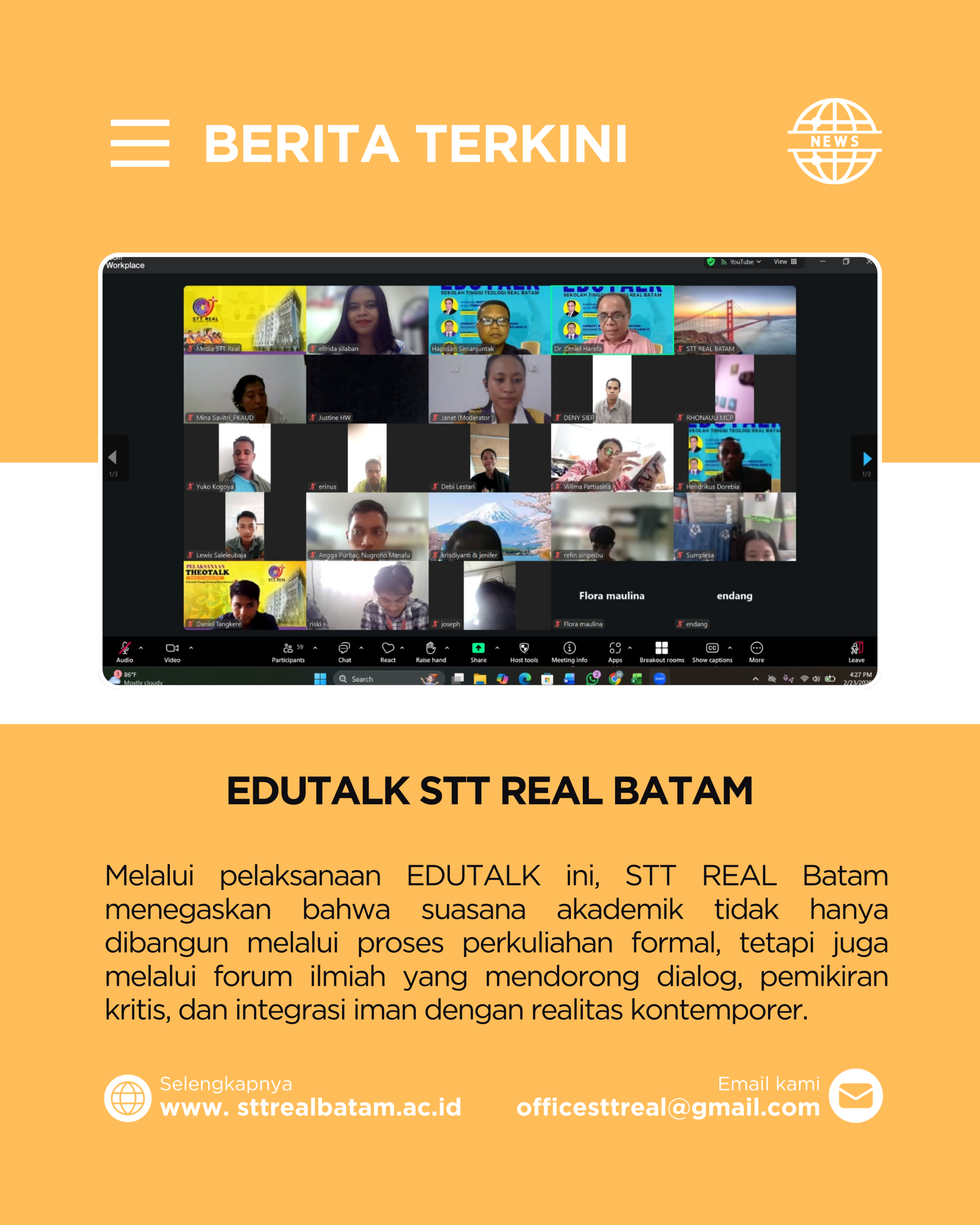 Platfrom EDUTALK menjadi suatu wadah bagi mahasiswa untuk terus meningkatkan Kompetensi dan Refleksi Teologis dalam Dunia Pendidikan Agama Kristen, dimana dalam kegiatan ini akan mengangkat topik-topik yang relevan dalam kebutuhan kompetensi mahasiswa dalam pendidikan di Sekolah Tinggi Teologi Batam. Seminar ini merupakan bagian dari komitmen Sekolah Tinggi Teologi REAL Batam untuk terus menjadi pusat pengembangan pemikiran dan praktik pendidikan Kristen yang kontekstual, kreatif, dan berbasis nilai-nilai Injil.
