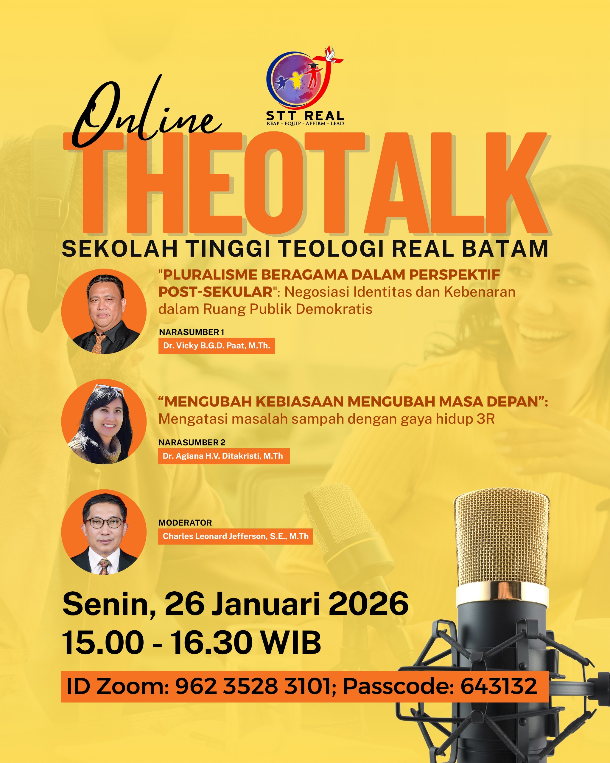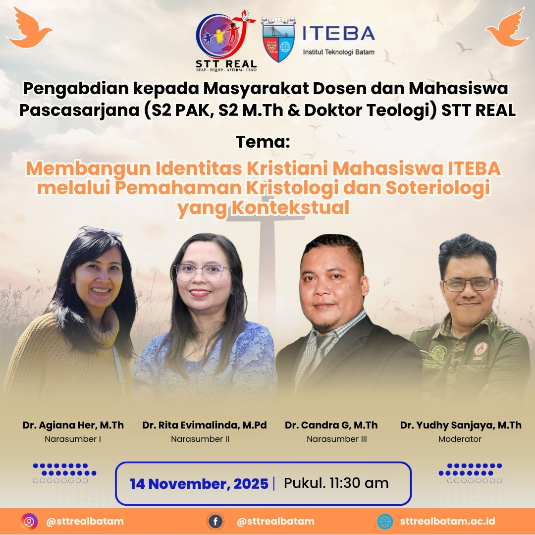 Sekolah Tinggi Teologi REAL Batam kembali mengundang Bapak/Ibu/Saudara/i untuk bergabung dalam diskusi teologis dan praktis melalui acara Online THEOTALK. Kali ini, kami menghadirkan dua topik yang sangat relevan dengan tantangan masa kini: