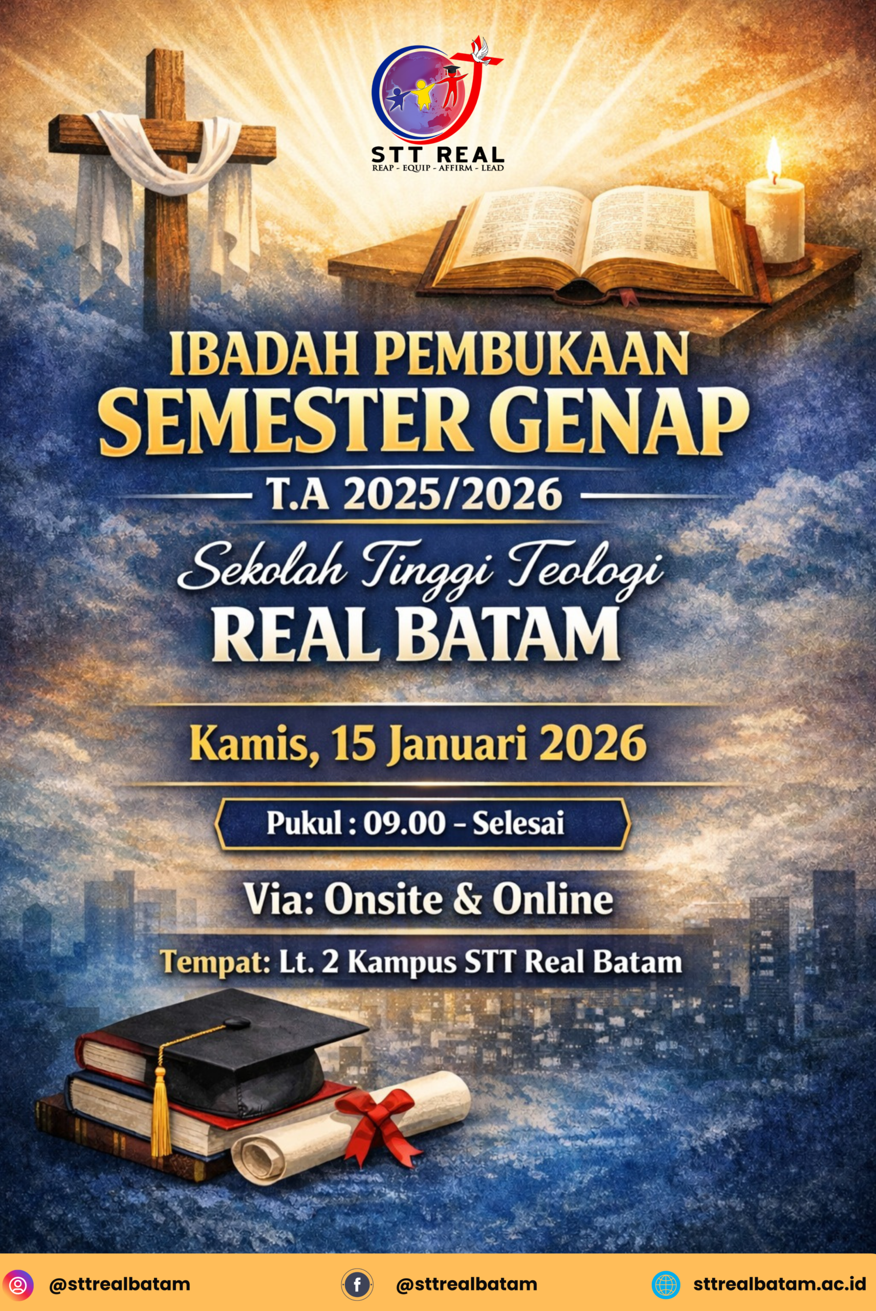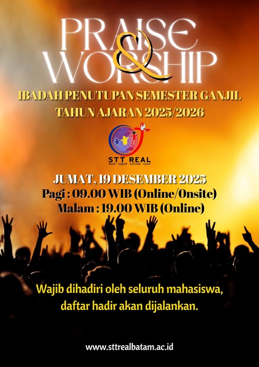 Memasuki Semester Genap T.A 2025/2026, Kami mengundang seluruh civitas akademika Sekolah Tinggi Teologi REAL Batam untuk hadir dalam Ibadah Pembukaan.