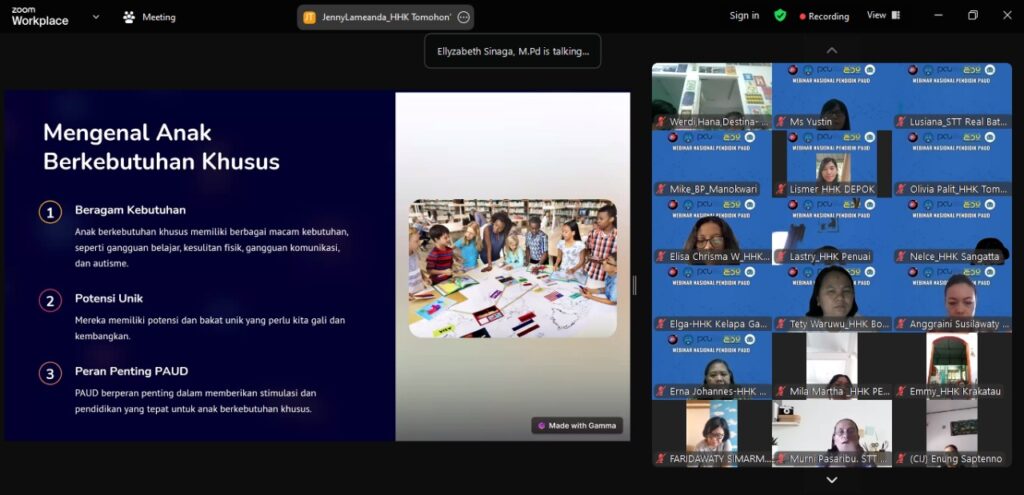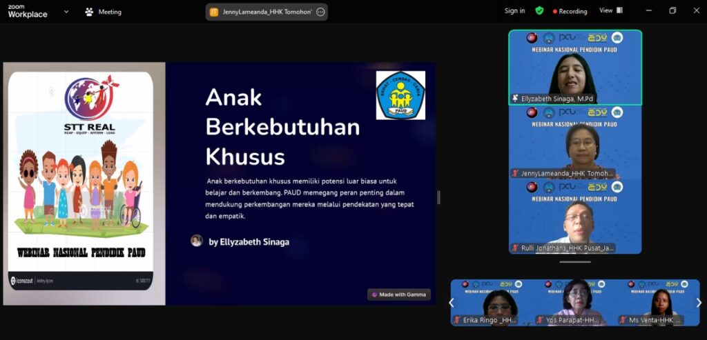 Webinar dimulai dengan sambutan oleh perwakilan dari Happy Holy Kids dan STT REAL Batam. Penjelasan mengenai tujuan webinar yaitu untuk meningkatkan layanan dan memperlengkapi para pendidik PAUD dalam menghadapi tantangan pendidikan saat ini. - Sesi 1: Anak Berkebutuhan Khusus/Special Need
